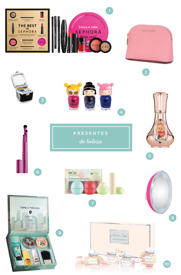 1. Kit The Best of Sephora: Sephora | 2. Nécessaire: Michael Kors | 3. Berloque: Vivara | 4. Kit de esmaltes: Kokeshi | 5. Spray corporal perfumado: Benefit | 6. Kit de pincéis: Sephora | 7. Kit de protetores labiais: Eos | 8. Espelho com lente de aumento: Tweezerman | 9. Kit Pore Proof: Benefit | 10. Coffret Miss Dior: Dior