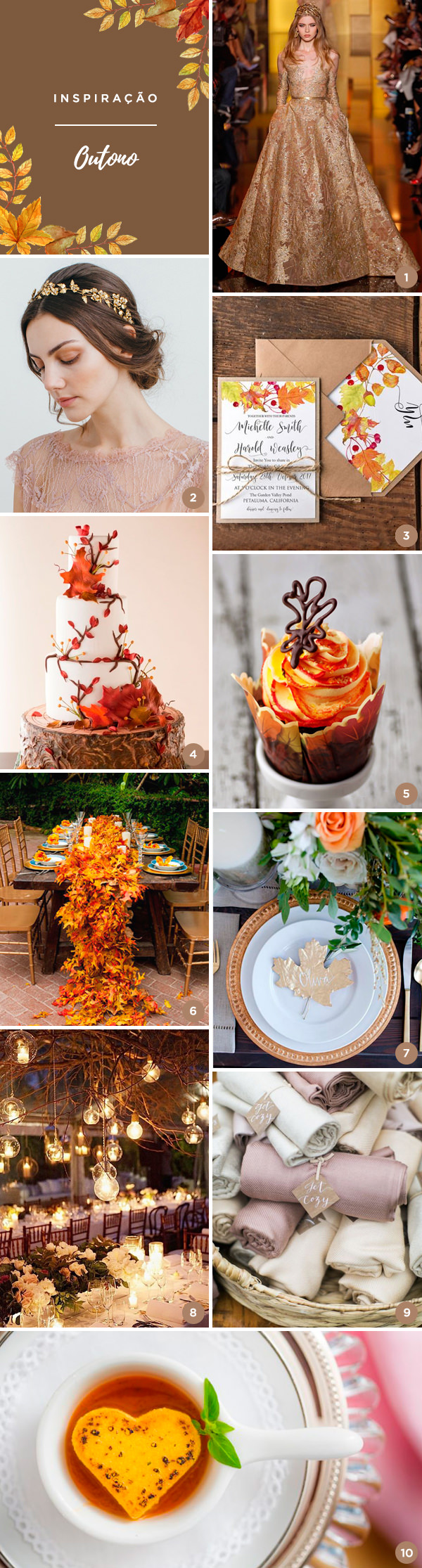1. Vestido nude e dourado: Elie Saab | 2. Tiara de folhinhas: Jennifer Behr | 3. Convite com ilustração de folhas: 4 Love Polka Dots | 4. Bolo decorado com folhas outonais: Cake Central | 5. Cupcake decorado com folha estilizada: Pint Sized Baker | 6. Decoração central de mesa: Pinterest | 7. Decoração de mesa com folha dourada: Pinterest | 8. Decoração com galhos e lâmpadas: Pinterest | 9. Pashminas para lembrancinha: Pinterest | 10. Polenta em formato de coração: Buffet Zest Sweet 15 Guide
