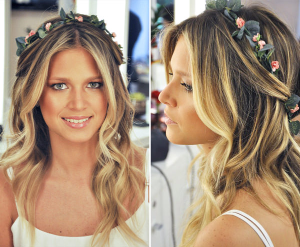 Helena Bordon apostou em coroa de flores e folhagens artificiais para complementar o penteado, que fica entre meio-preso e solto. O resultado foi um look super delicado: