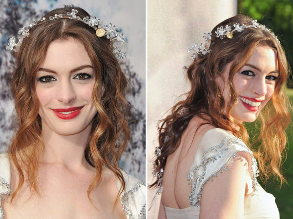 Anne Hathaway apostou em acessório de florzinhas para complementar o look de fada: