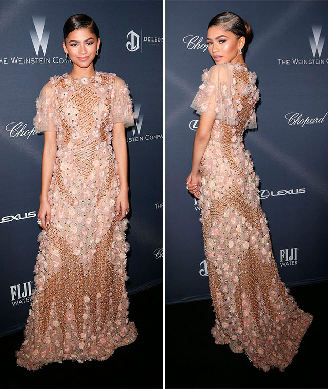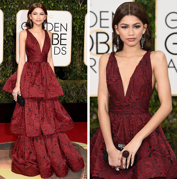 Aqui, o vestido Marchesa deu um ar dramático e elegante ao visual de Zendaya para os Golden Globes (2016):
