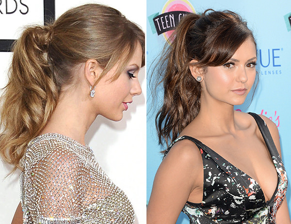 Taylor Swift e Nina Dobrev apostaram em rabos de cavalo com os fios levemente ondulados e a franja lateral: