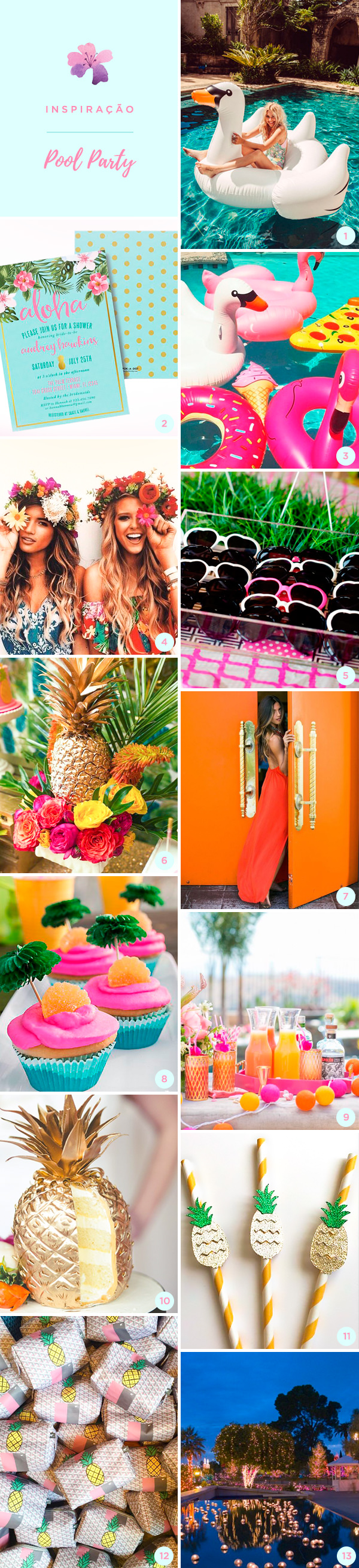 1. Boia em formato de cisne: Amazon | 2. Convite em clima tropical: Etsy | 3. Boias em formatos divertidos: Amazon | 4. Inspiração de look e coroa de flores: Rocky Barnes | 5. Óculos escuros: Pinterest | 6. Decoração com abacaxi dourado e flores coloridas: Pinterest | 7. Inspiração de look: Rocky Barnes | 8. Cupcakes em clima tropical: Party City | 9. Decoração para o bar de bebidas não alcoólicas: Pinterest | 10. Bolo dourado em formato de abacaxi: Best Friends for Frosting | 11. Canudo com abacaxis: Etsy | 12. Nécessaire com estampa de abacaxis: Flávia Carvalho Pinto | 13. Inspiração de decoração com velas e luzinhas: Pinterest