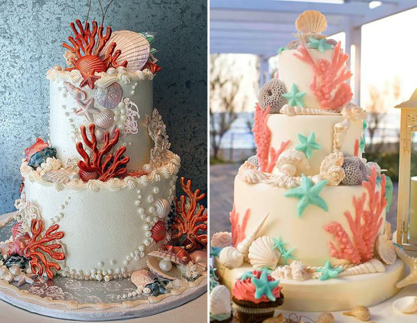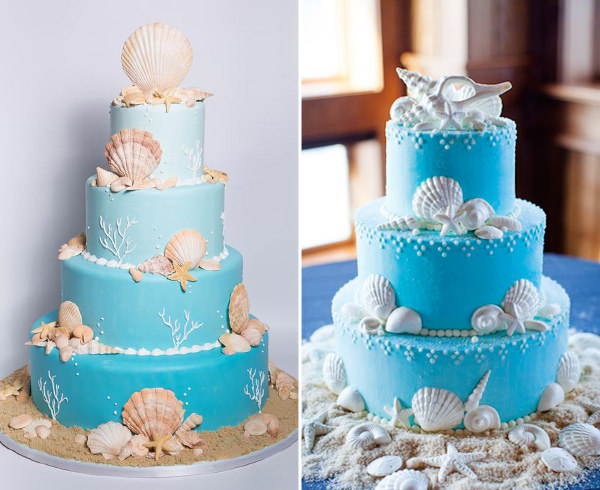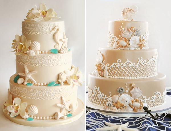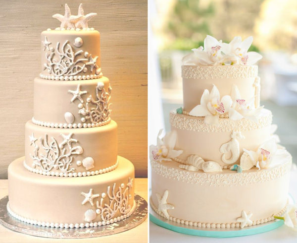 O bege faz referência à areia, por isso, tem tudo a ver com o tema praia. Conchas, cavalos marinhos, corais e estrelas do mar são alguns dos elementos que complementam o bolo: