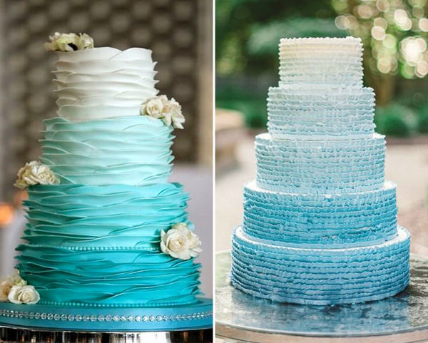 Prefere um estilo mais minimalista? O bolo com babados com degradê de azul é uma boa aposta: