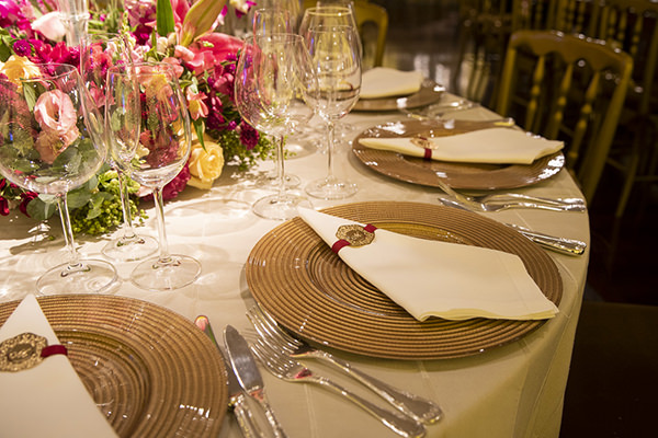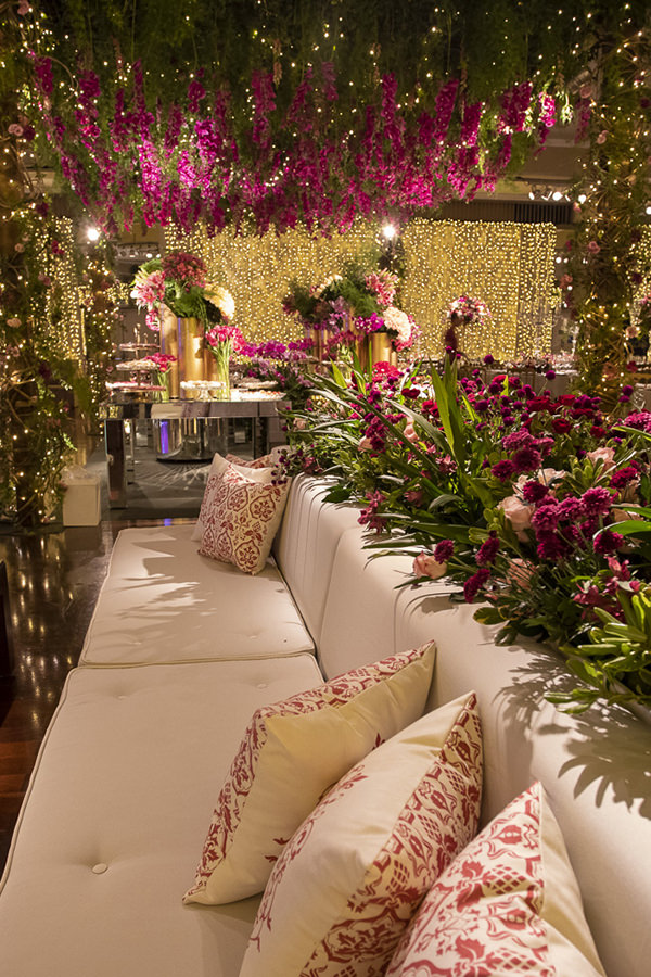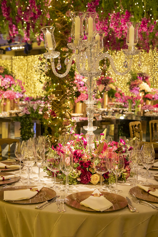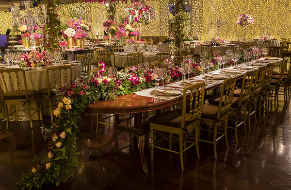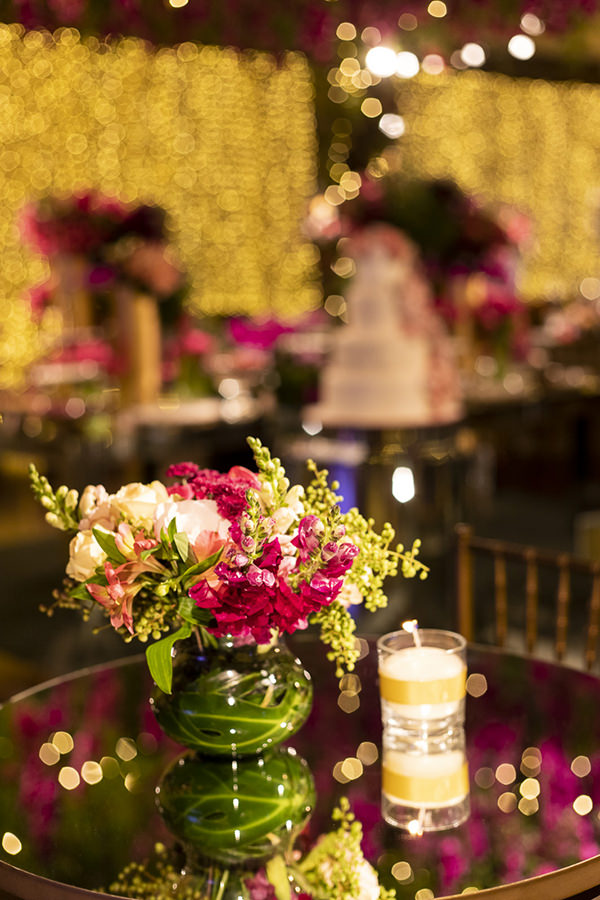 A mesa de doces foi o destaque do salão! Sob um enorme arranjo aéreo de orquídeas rosas, o cenário foi composto por duas mesas laterais, onde ficaram os docinhos Piece of Cake misturados a lindos arranjos e vasos de flores e, ao centro, uma mesa menor redonda e espelhada, onde o bolo de quatro andares decorado com flores de açúcar, também da Piece of Cake, ganhou destaque merecido.