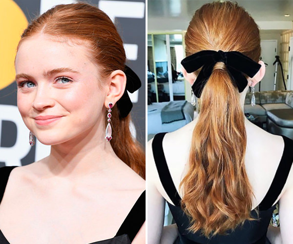 No red carpet, quem apostou no rabo de cavalo com laço de veludo foi Sadie Sink (a Max, de Stranger Things):