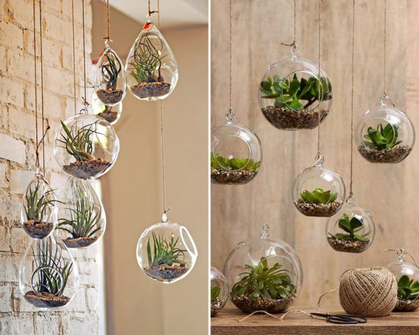 Os terrários redondos, em estilo aquário, deixam a decoração super delicada: