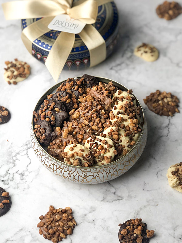 Pastiglie di cioccolato (pastilhas de chocolate cobertas de nuts caramelizados e pedacinhos de grissini), da Dolssini Dolci: