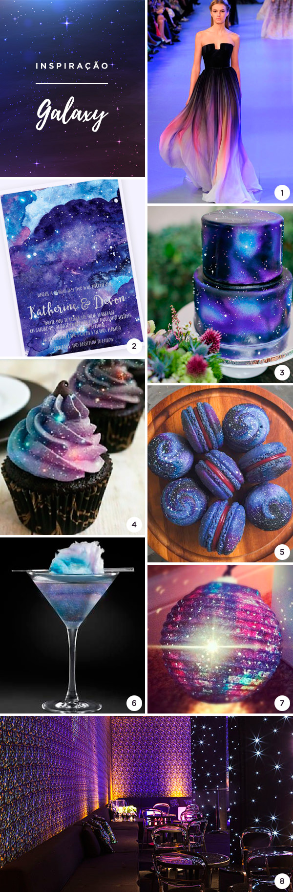 1. Vestido em tons de roxo: Elie Saab | 2. Convite em aquarela: Etsy | 3. Bolo inspirado na galáxia: Pinterest | 4. Cupcake inspirado na galáxia: Japan Candy Box | 5. Macarons inspirados na galáxia: Pinterest | 6. Drink cotton candy em tons de roxo e azul: Pinterest | 7. Mini-luminária japonesa com desenho inspirado na galáxia: Etsy | 8. Decoração em roxo e preto, com pontos de luz: Nathalie Bacellar