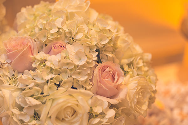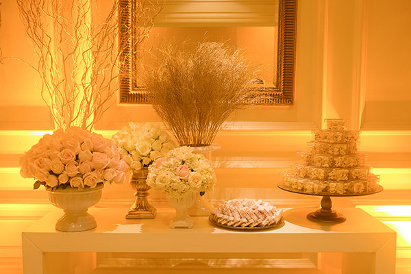 A mesa de doces também teve hortênsias, rosas e orquídeas, combinadas a galhos dourados.