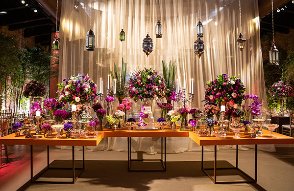 CASA BISUTTIPortfólio assinou o projeto, que se baseou em tons de rosa, roxo, fúcsia e dourado. Na entrada do salão, o destaque vai para a mesa de doces, com grandes arranjos florais e castiçais de metal envelhecido.