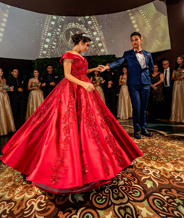 Como Duda contou lá no começo, um dos seus grandes sonhos para a festa de 15 anos eram os vestidos do grande dia. “Sempre sonhei em ser princesa, então o usei três vestidos na minha festa. O primeiro, para a recepção, foi um modelo sereia bege com mangas de tule e algumas flores bordadas. O segundo, para a hora da valsa foi o meu sonho: um vestido vermelho modelo princesa bem marcante, todo bordado com arabescos, para fazer remeter ao estilo árabe. Por fim, o último vestido, da balada, foi curto e azul marinho, com gola alta e pedrarias.”