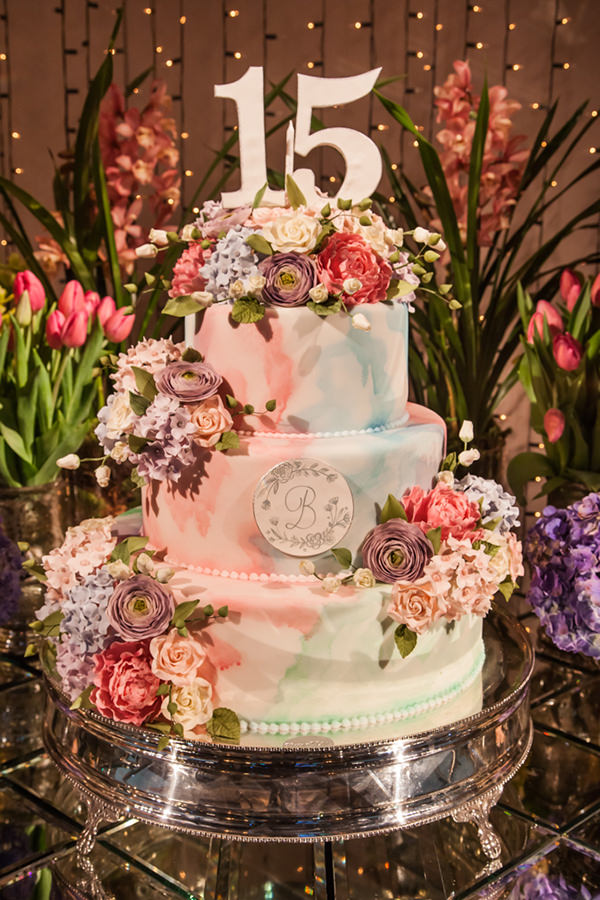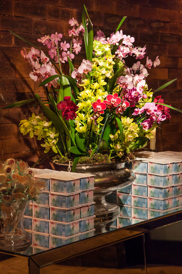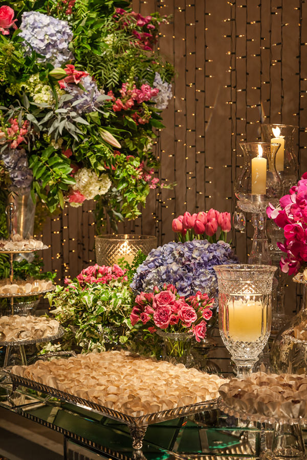 A Piece of Cake fez um bolo com toques de aquarela, exatamente como Bianca queria. Os tons suaves da cartela de cores deixou a decoração vibrante e, ao mesmo tempo, romântica. Diversificado, o projeto floral teve desde tulipas e rosas até hortênsias e diferentes espécies de orquídeas.