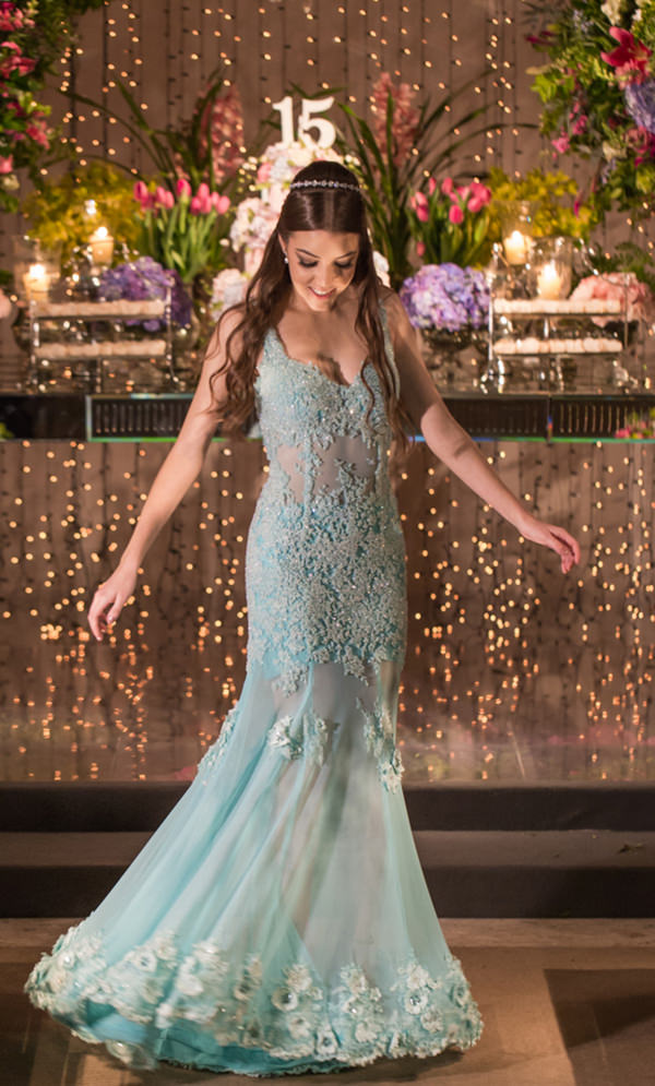 Para receber os convidados, Bianca usou vestido azul com aplicações florais e leve transparência, assinado por Israel Valentim Sweet 15 Guide