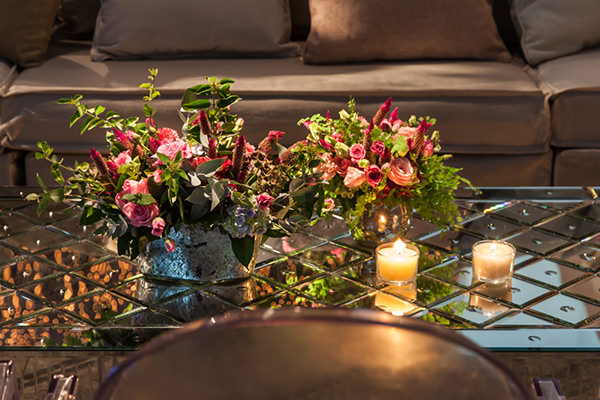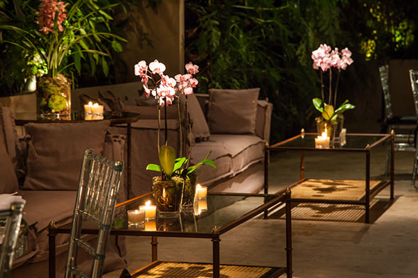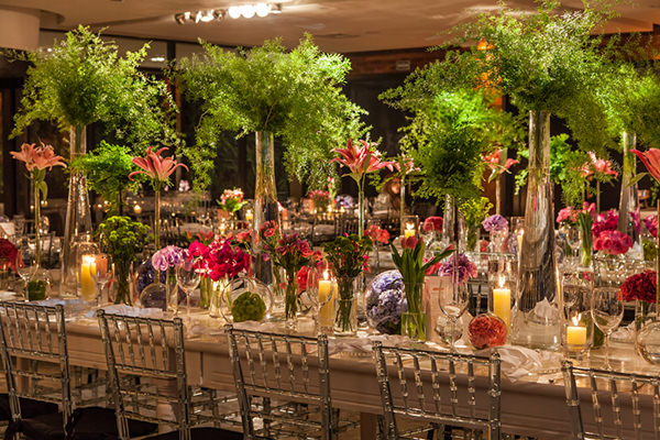 Arranjos pequenos compuseram a decoração das mesas, junto com folhagens em vasos altos.