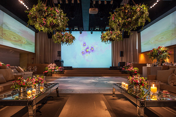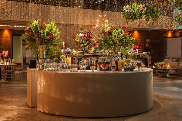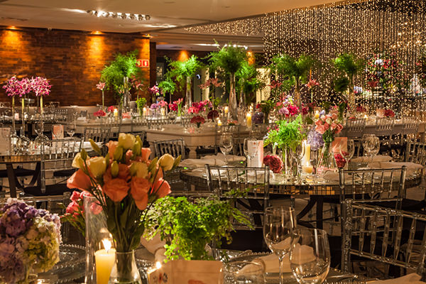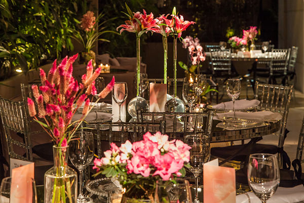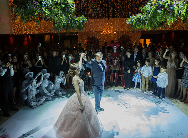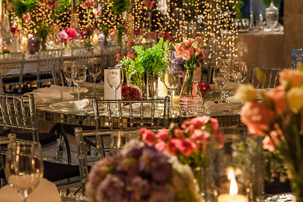 Para a decoração, a debutante queria um projeto inspirado, e não temático, além de muitas flores. “Foi a partir daí que surgiu a ideia de Alice no País das Maravilhas ou ‘Jardim de Alice’. Mas, como ela não queria uma festa temática, optamos por focar nos personagens que animaram a noite“, explica Wal. E o resultado foi um conceito colorido e vibrante, com luzinhas e móveis espelhados.