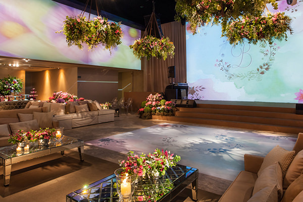 Os arranjos aéreos reforçaram o clima de jardim da festa.