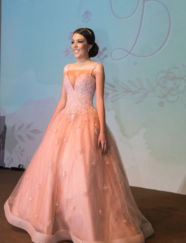 Para a valsa, Bianca escolheu vestido blush, com bordados e delicado toque de brilho.