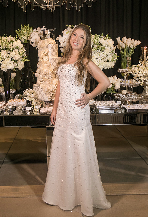 Para assinar o look de Eduarda, a escolhida foi Isabella Narchi. “Fui em um casamento e adorei o vestido da noiva! Então, ela me indicou a Isabella”, conta a mãe, Fabiana. O modelo escolhido pela debutante foi um tomara que caia em branco com delicadas aplicações de brilho.