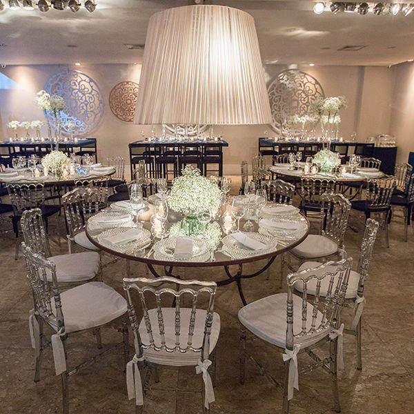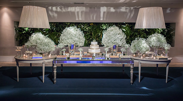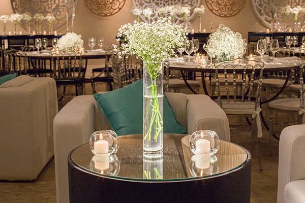 Os arranjos de mosquitinhos/gypsophilas compuseram toda a decoração, inclusive da mesa do bolo. A combinação entre móveis clássicos e contemporâneos garantiu o mix de estilos que a debutante queria.