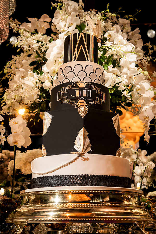 Assinado por The King Cake, o bolo, em preto, branco e dourado, seguiu à risca o tema da festa.