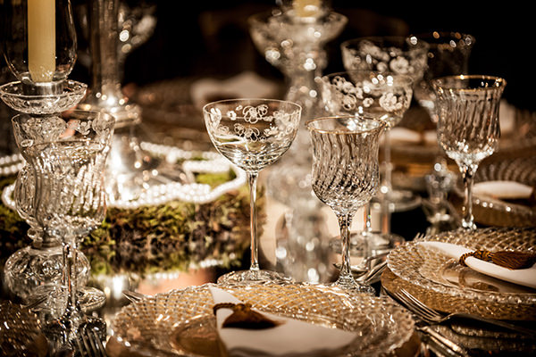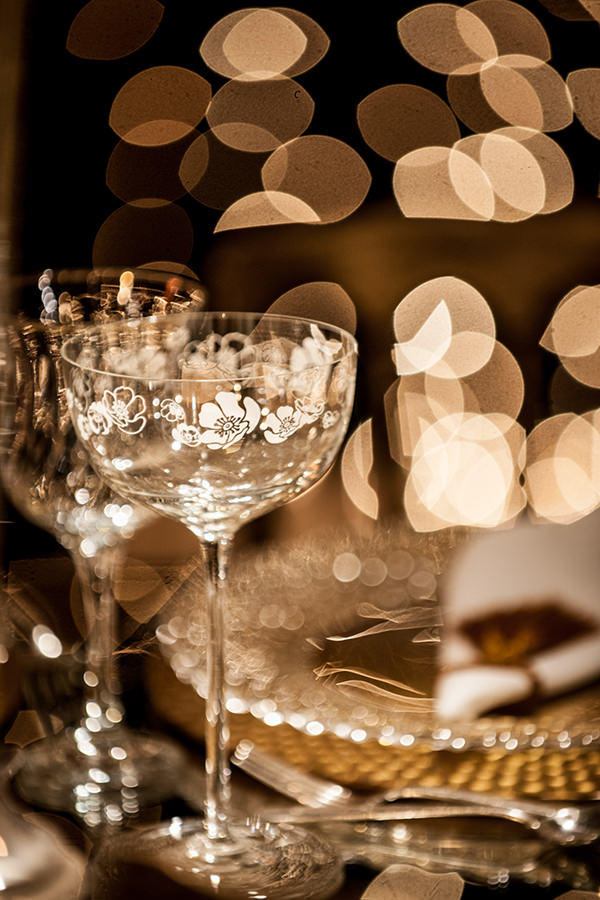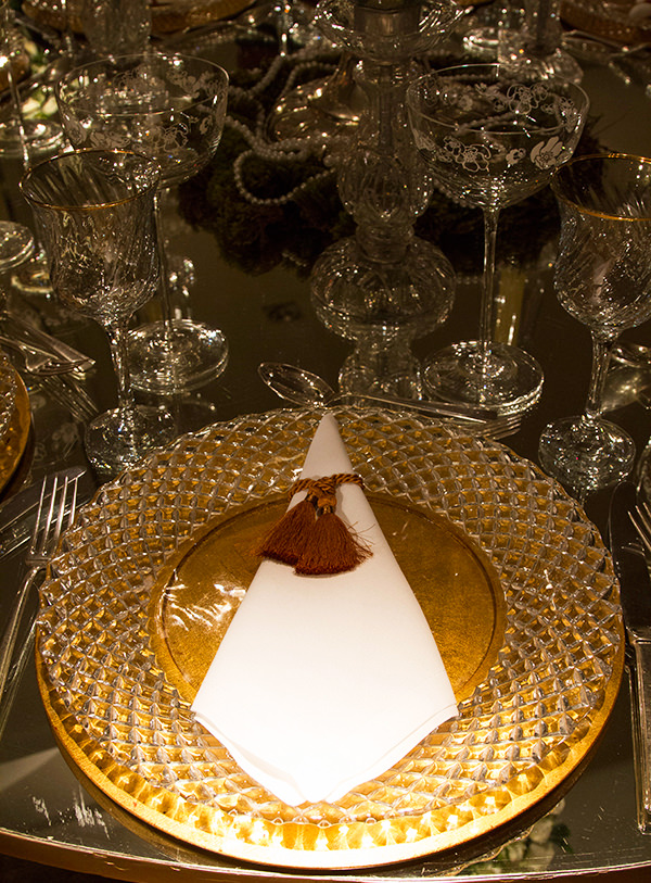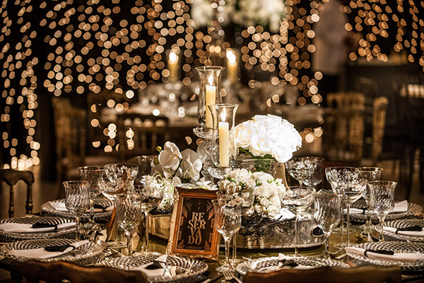 As mesas dos convidados foram decoradas com taças, sousplats e castiçais de cristal, além de um toque de pérolas. As cascatas de luzinhas deixaram o espaço ainda mais glamouroso!