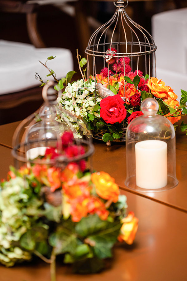 A área dos doces foi montada com mesas de madeira em diferentes alturas, que deixaram o ambiente mais dinâmico. A plotagem da Casa de Julieta reforçou a atmosfera da festa! E para complementar o espaço, projeto floral em tons de vermelho e terracota.