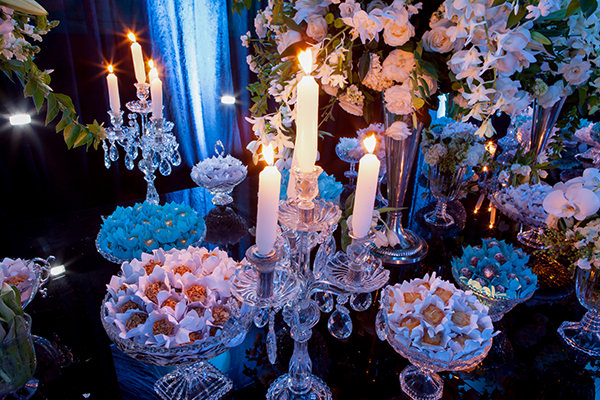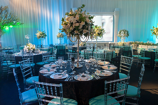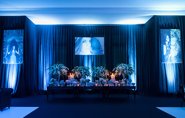 A iluminação também em tom de azul seguiu a paleta de cores da festa. Para dar um toque moderno ao projeto, toalhas de mesa em preto e cadeiras em acrílico. As árvores francesas complementaram o conceito.