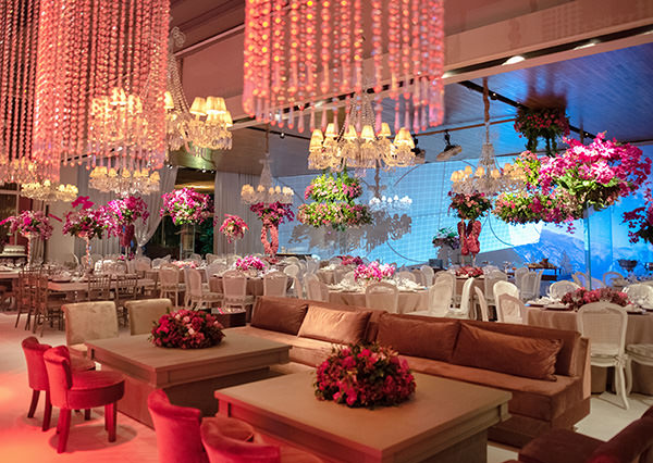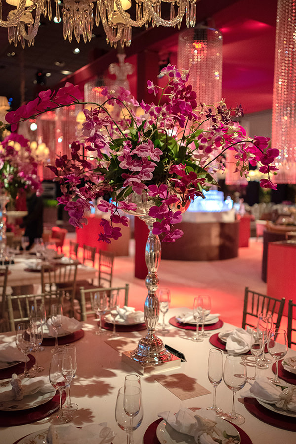 Nno projeto floral, o rosa se destacou em orquídeas, hortênsias e rosas, que não compuseram apenas os arranjos das mesas, como também decoraram as colunas e algumas paredes do espaço do espaço, trazendo o clima de jardim florido para dentro da festa.