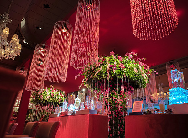 A mesa de doces foi um dos pontos centrais da decoração, com o exuberante lustre de cristal e o grande arranjo floral sobre a mesa. À frente e em destaque, o bolo hexagonal de oito andares, decorado com relevo e texturas rosé e flores de açúcar entre os andares.