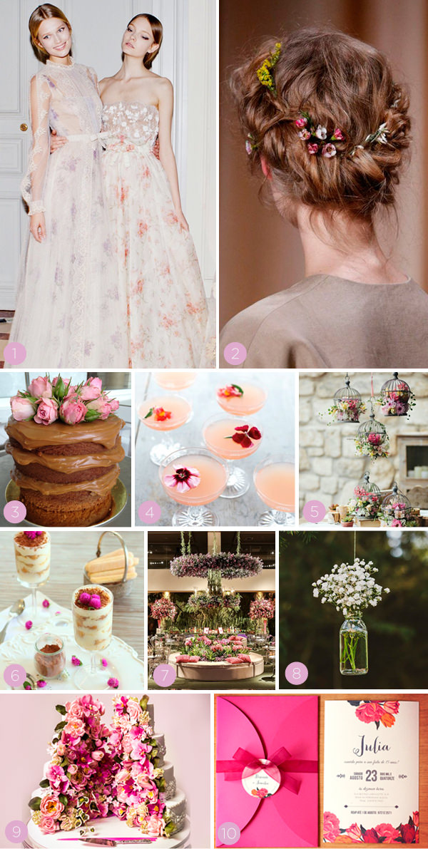 1. Vestidos: Valentino | 2. Penteado com mini-flores: desfile de Alta Costura Primavera 2015 da Valentino | 3. Mini naked cake: Le Jardin Secret | 4. Drinks com flores: Martha Stewart | 5. Arranjos em gaiolas: Marie Claire Maison | 6. Tiramsù: For the feast | 7. Decoração: festa da Vitoria | 8. Vaso pendente: Wedding Ideas Mag | 9. Bolo: The King Cake | 10. Convite: Phatt Design
