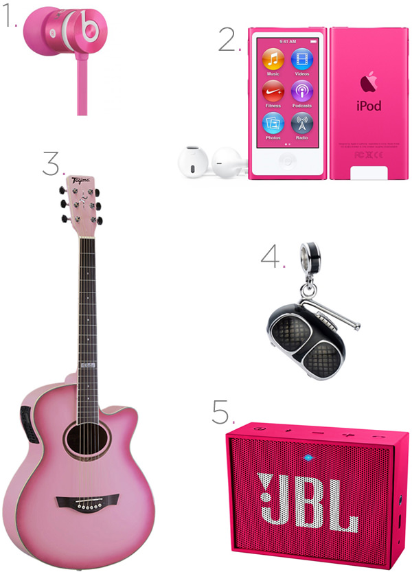 1. Fone: Beats | 2. Ipod: Apple | 3. Violão: Tagima | 4. Berloque: Vivara | 5. Caixa de som: JBL