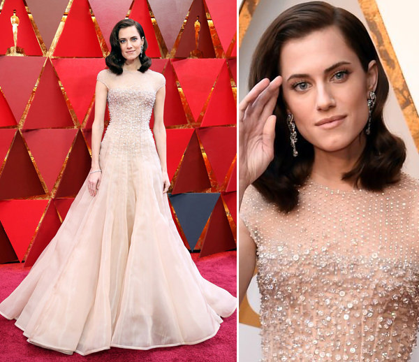 Allison Williams escolheu vestido de organza nude bordado Armani Privé. O corte da saia, que se abre mais na barra, está simplesmente maravilhoso: