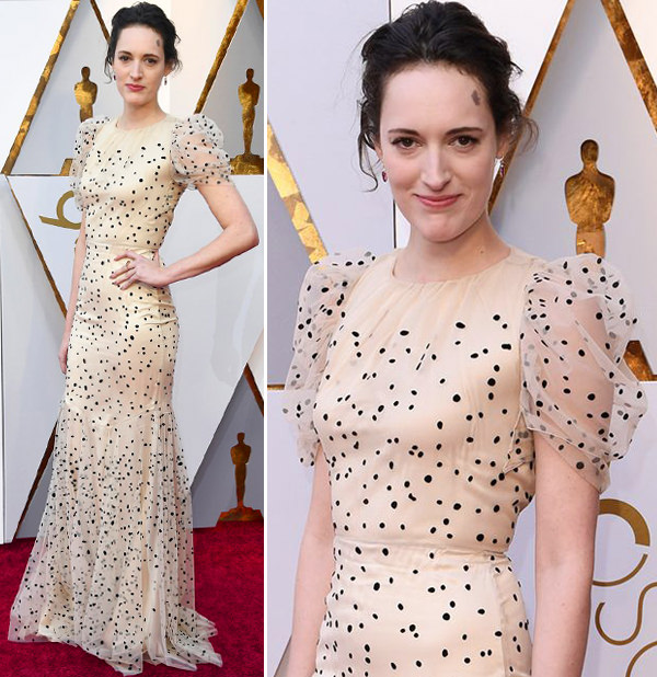Muito fofo o vestido Vionnet todo pintadinho com manguinhas bufantes de Phoebe Waller-Bridge: